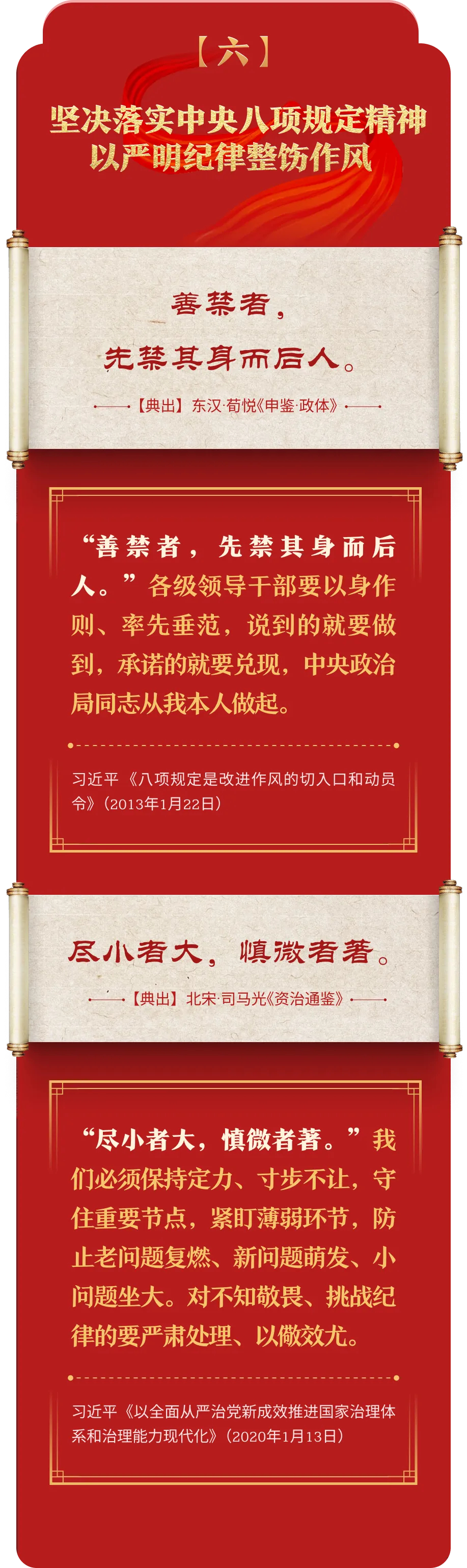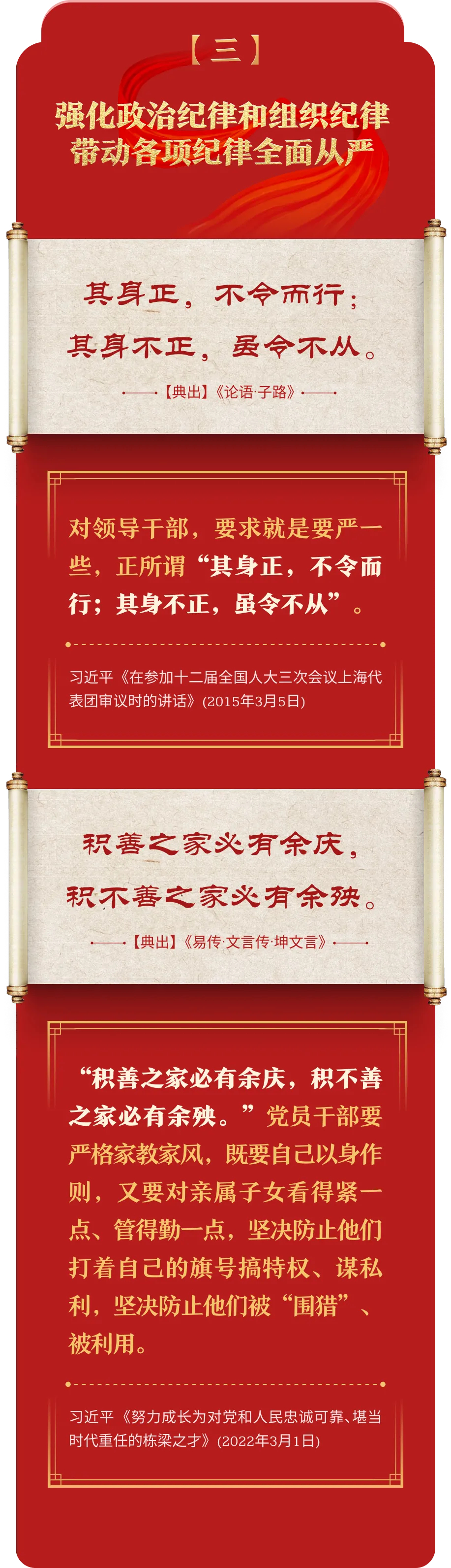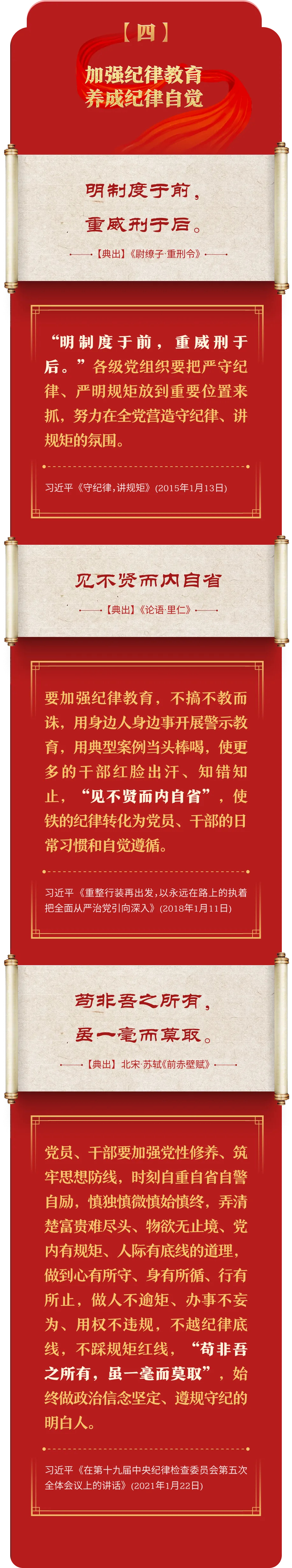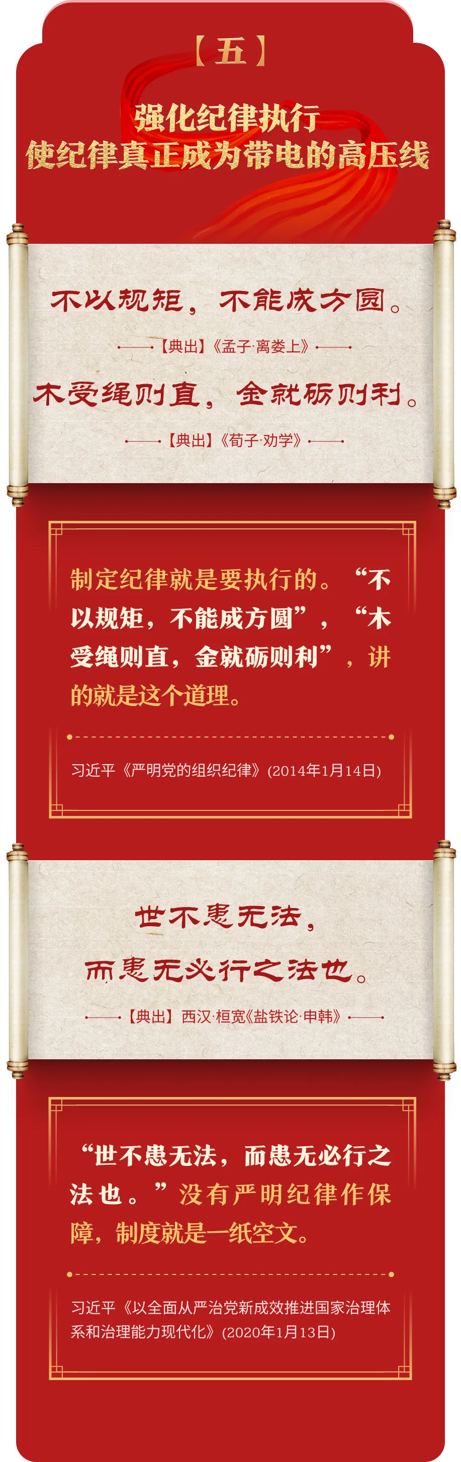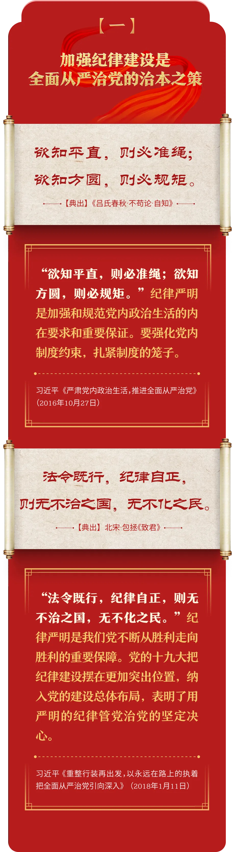 编者按:加强纪律建设是全面从严治党的治本之策。党的十八大以来,习近平总书记围绕全面加强党的纪律建设发表一系列重要论述,立意高远,内涵丰富,思想深刻,引导党员干部学纪、知纪、明纪、守纪,真正把纪律规矩转化为政治自觉、思想自觉、行动自觉,确保全党目标一致、团结一致、步调一致。在这些重要论述中,总书记精妙运用古代典籍经典名句,以古喻今、启迪思想、激荡精神,让我们一起来学习!